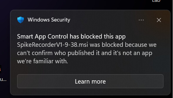 Because SpikeRecorder is a specialized educational tool (and not a massive commercial app), Windows Smart App Control sometimes flags it simply because it doesn’t recognize it yet. It blocks the file, which causes the Windows Installer to throw that generic system administrator error.